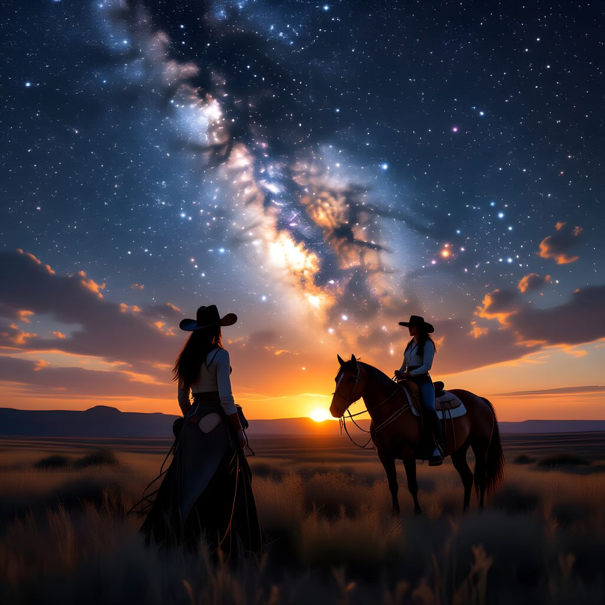 A solitary cowgirl, silhouetted against a vast, star-dusted prairie sky, her horse standing patiently beside her. The scene is bathed in the ethereal glow of a nebula, with distant galaxies swirling above. The atmosphere is one of quiet contemplation and immense scale. Rendered in a hyperrealistic style ...