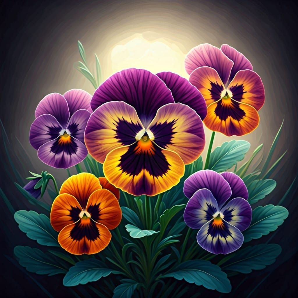 A striking picture of pansies with multicolored petals in a fantasy setting. The image is rendered as a 3D diamond painting using pointillism techniques, resulting in a dreamy digital art aesthetic.