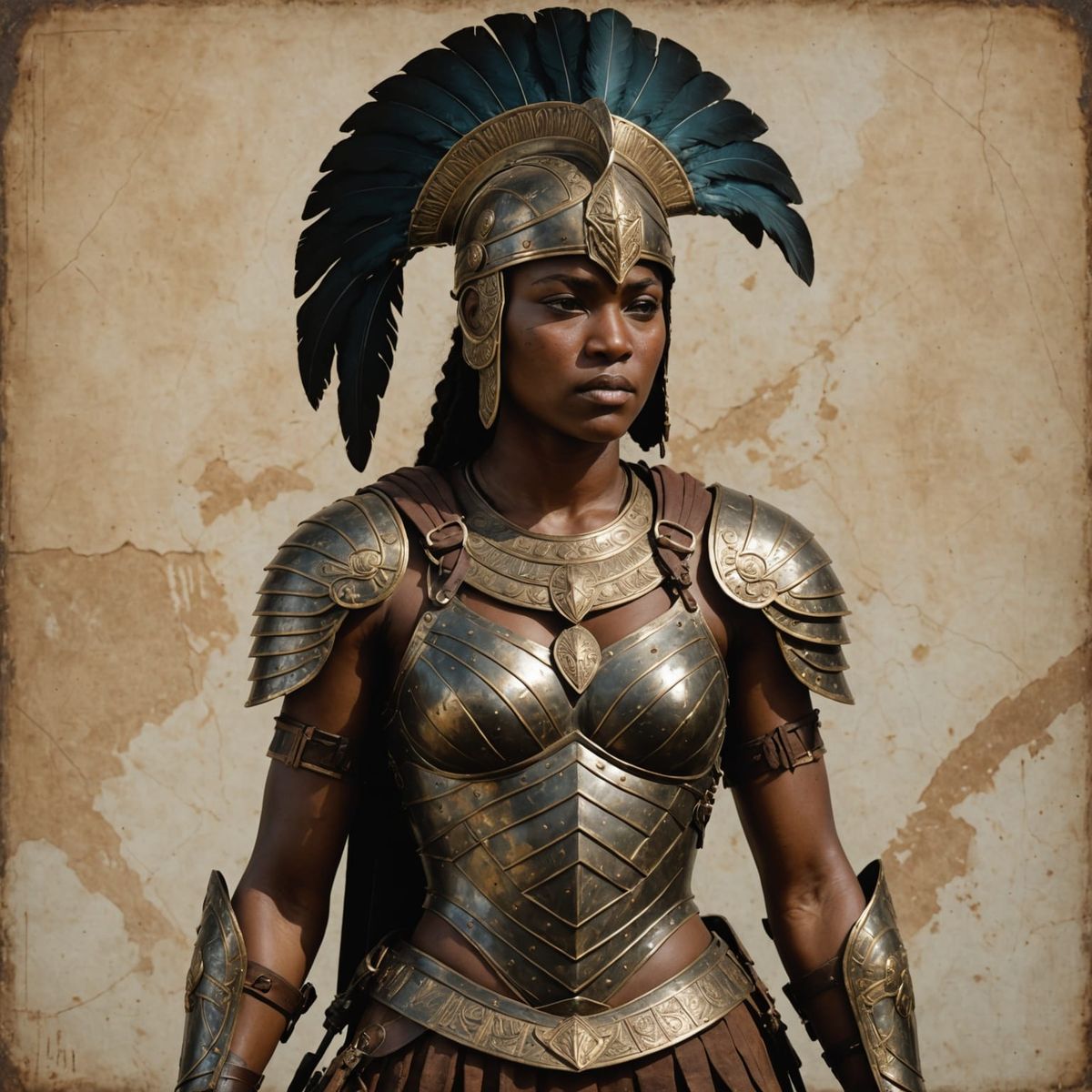 This image shows a determined African female warrior in her late twenties, wearing detailed bronze and leather Greek armor. Spotlight highlights her strength against a dark background.