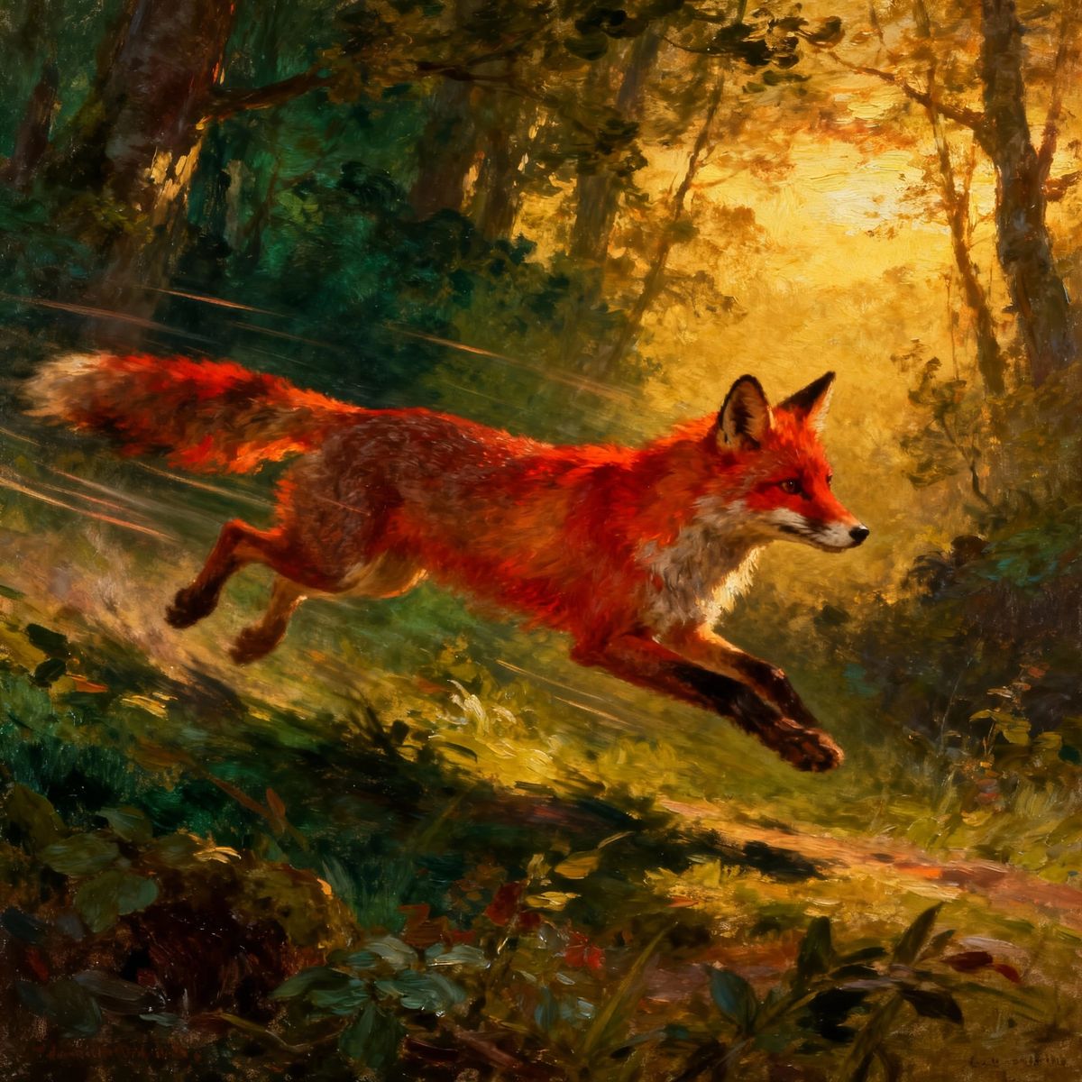 This image shows a red-orange fox running through a deep green forest, rendered in a fine classical painting style with rich colors and dramatic lighting to capture wild energy.