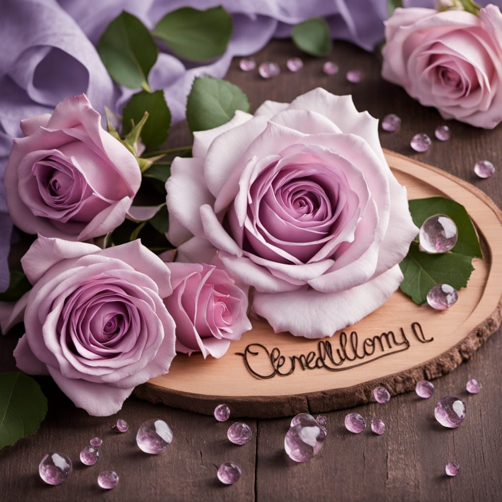 This image showcases a vintage-style cinematic photo of a lilac and pink rose with water droplets. A wooden plaque reads "Excellent!!" with a heart, set against a rustic backdrop, evoking love and devotion.