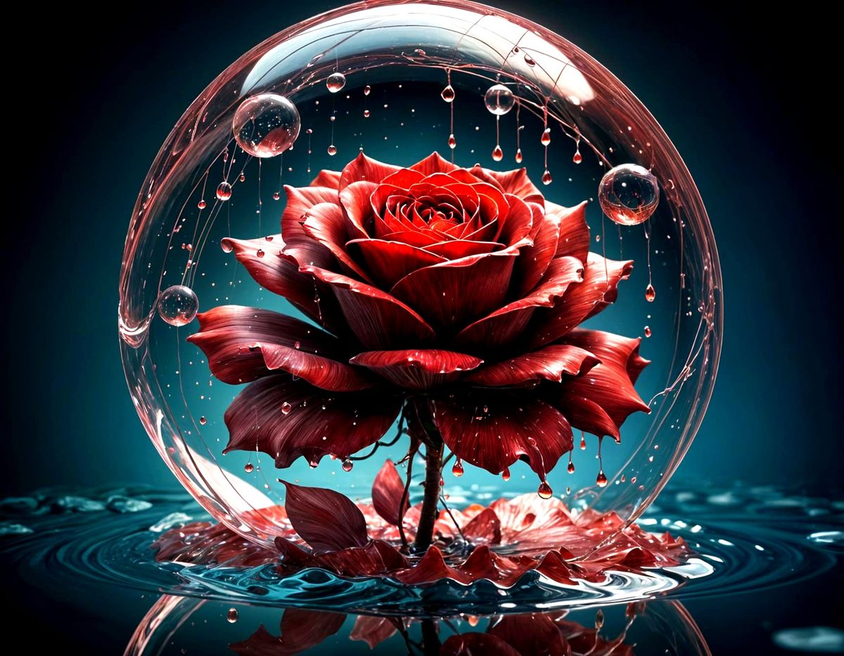 This image depicts a single dark blood rose sculpted from liquid blood, encased within a transparent dome of flowing water. It features intricate details and a dramatic, atmospheric digital matte painting style.