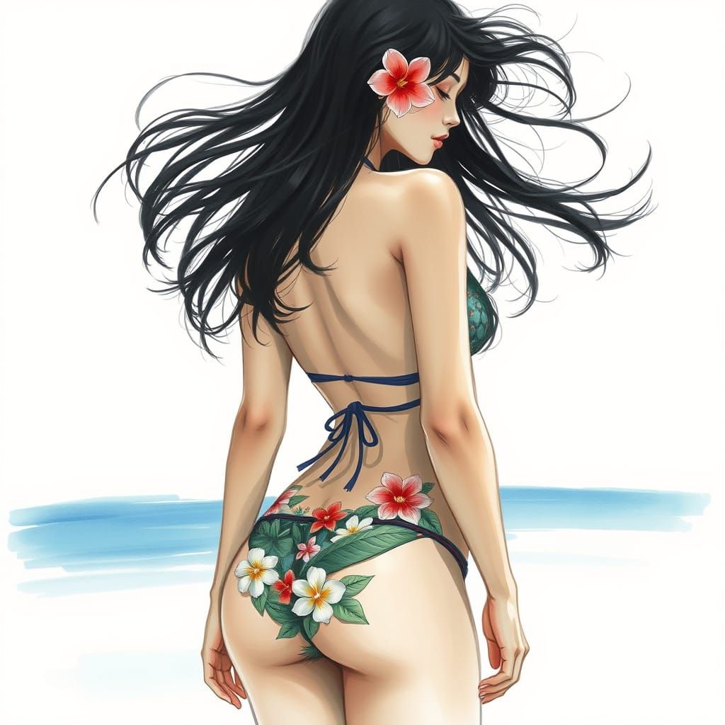 This image shows a woman in a bikini, seen from the back, adorned with tropical flowers. The portrait is rendered in charcoal with dynamic linework and ethereal elegance.