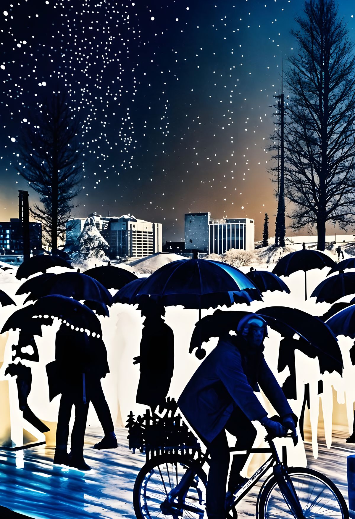 A realistic photograph of a woman holding a glass globe filled with black snow, evoking a sense of dystopian atmosphere and deep, natural colors.