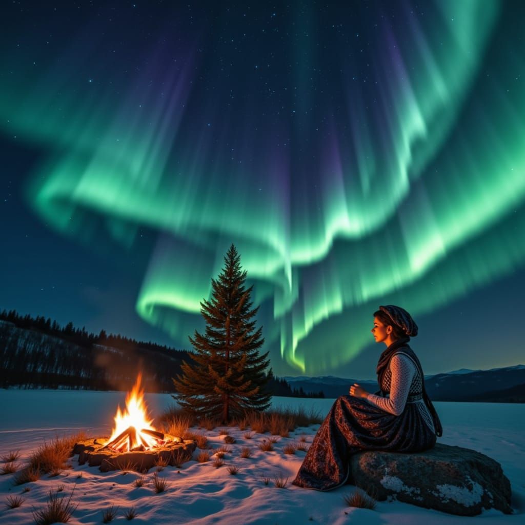 This image showcases Tsarina Evdokiya in pre-Petrine Russian fashion, adorned in a golden sarafan and kokoshnik, set against a tundra backdrop with a campfire and vibrant aurora. Photorealistic style with bokeh and volumetric lighting.