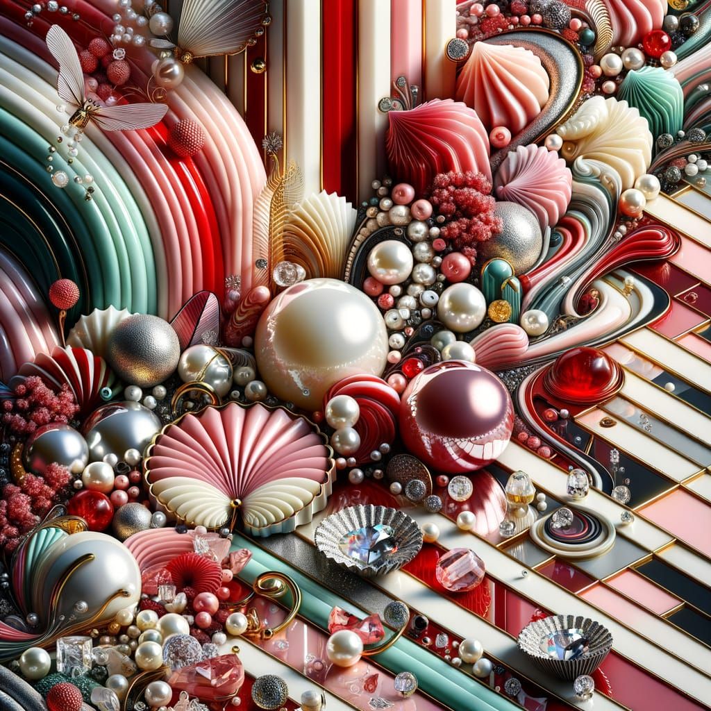 This highly detailed image features a hyper-realistic design with gelato colors, red and white stripes, pearls, seashells, and precious gems. Luminous gold, silver, and vivid splashes create high contrast.