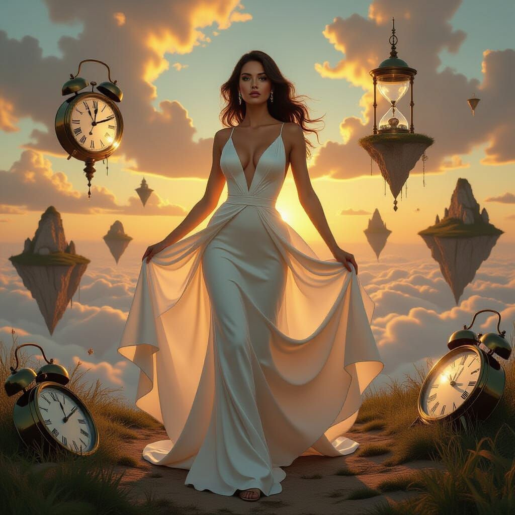 A photorealistic surrealist painting featuring a woman in a white dress within a dreamlike landscape of melting clocks and floating islands, bathed in dramatic golden hour light.