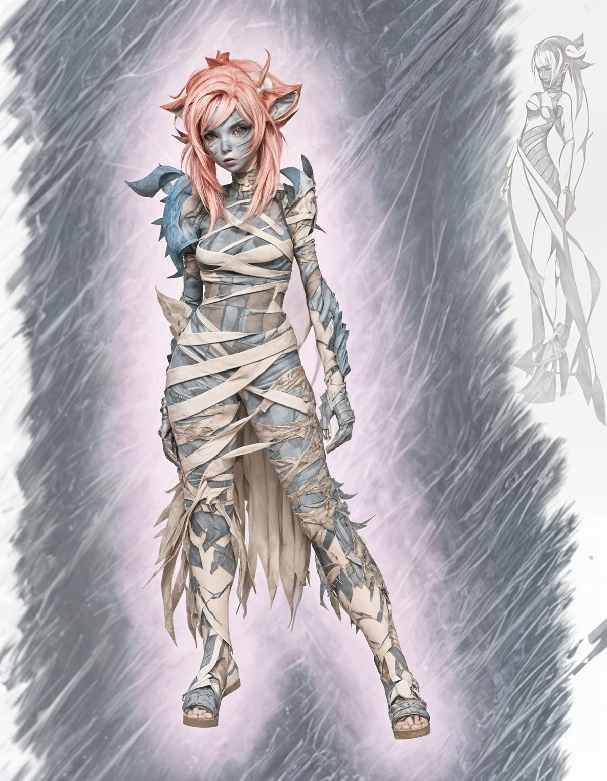 This image depicts Gwen Tennyson from the Ben 10 Original 2005 series as a monster girl, with intricate bandages as clothing and stitches covering her skin, rendered in stunning 3D anime art with ultrafine detail.
