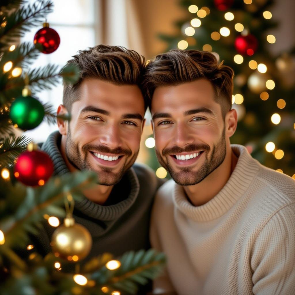 This image shows two handsome men sharing a loving moment while decorating a Christmas tree. The scene is depicted with hyperrealistic detail and soft, natural lighting, evoking cinematic photography.