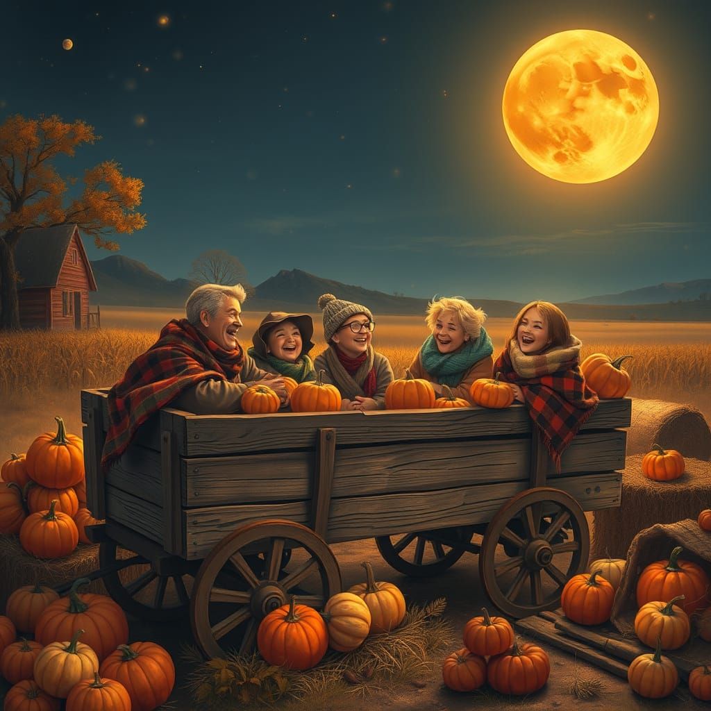 This image shows a hayride scene under a large harvest moon. Friends are laughing in a wagon filled with pumpkins and hay bales, depicted with warm lighting and rich autumn colors.