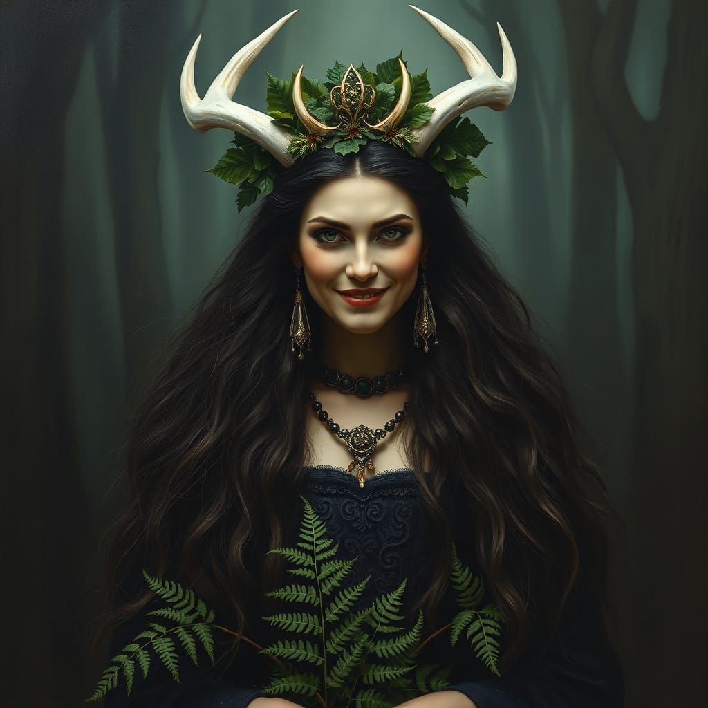 A striking picture of a forest queen with bone horns and a holly crown, seated on a bramble throne. She wears a long fern dress in this oil painting.