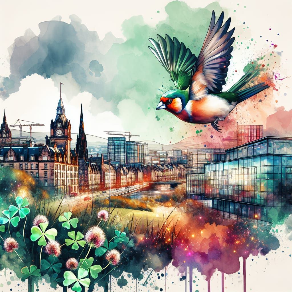 A finch soars above a Scottish cityscape featuring watercolor buildings and iridescent clovers. The scene uses a splashed watercolor technique, evoking pre-20th-century landscape art.