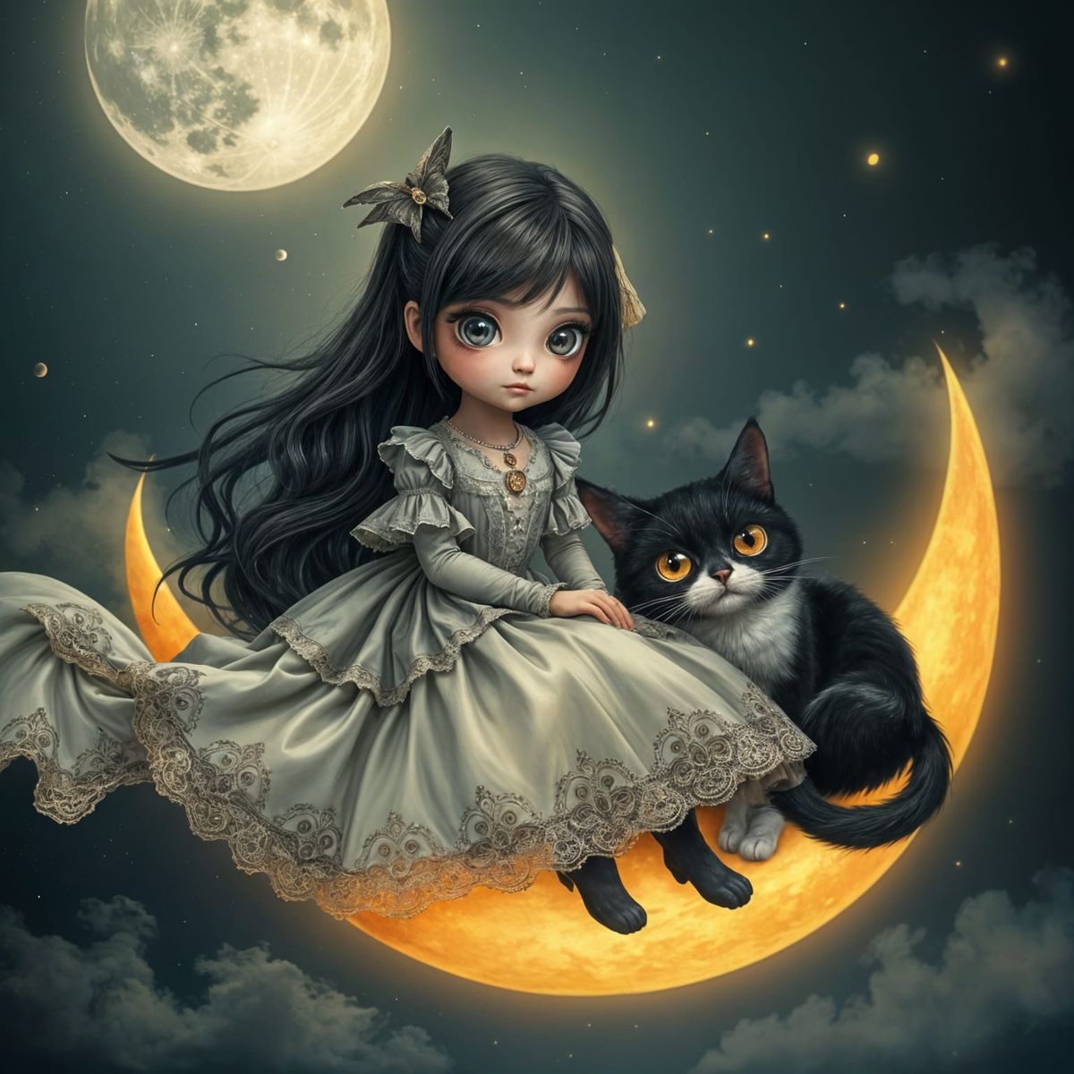 This image shows a melancholic girl with large, reflective eyes seated on a glowing crescent moon, wearing a Victorian dress. A black-and-white cat sits beside her in this surreal, painterly fantasy.