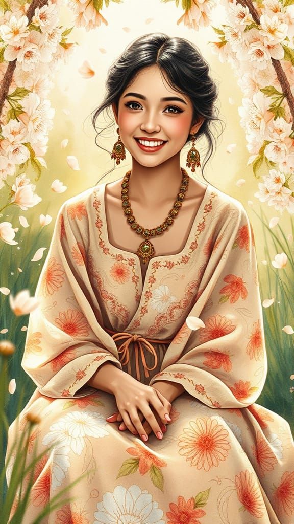 This image shows a smiling woman in a flower dress sitting in a spring garden. Soft petals fall around her, illuminated by warm sunlight in this watercolor-style artwork.