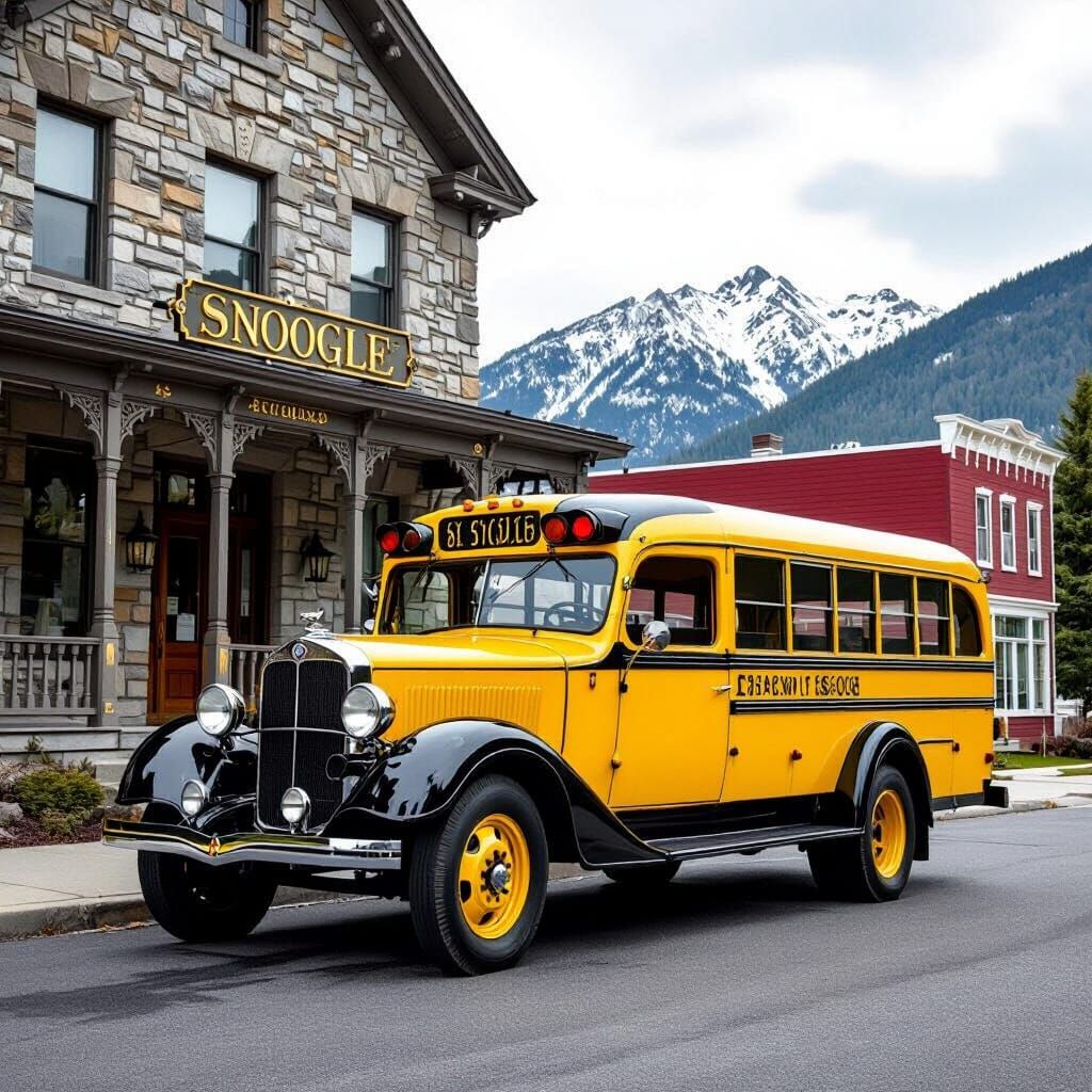 This image depicts a vintage yellow school bus with Art Deco styling parked on a street. A historic stone building with gold signage stands behind it, alongside a red commercial building, all against a backdrop of snowy mountains and an overcast sky.