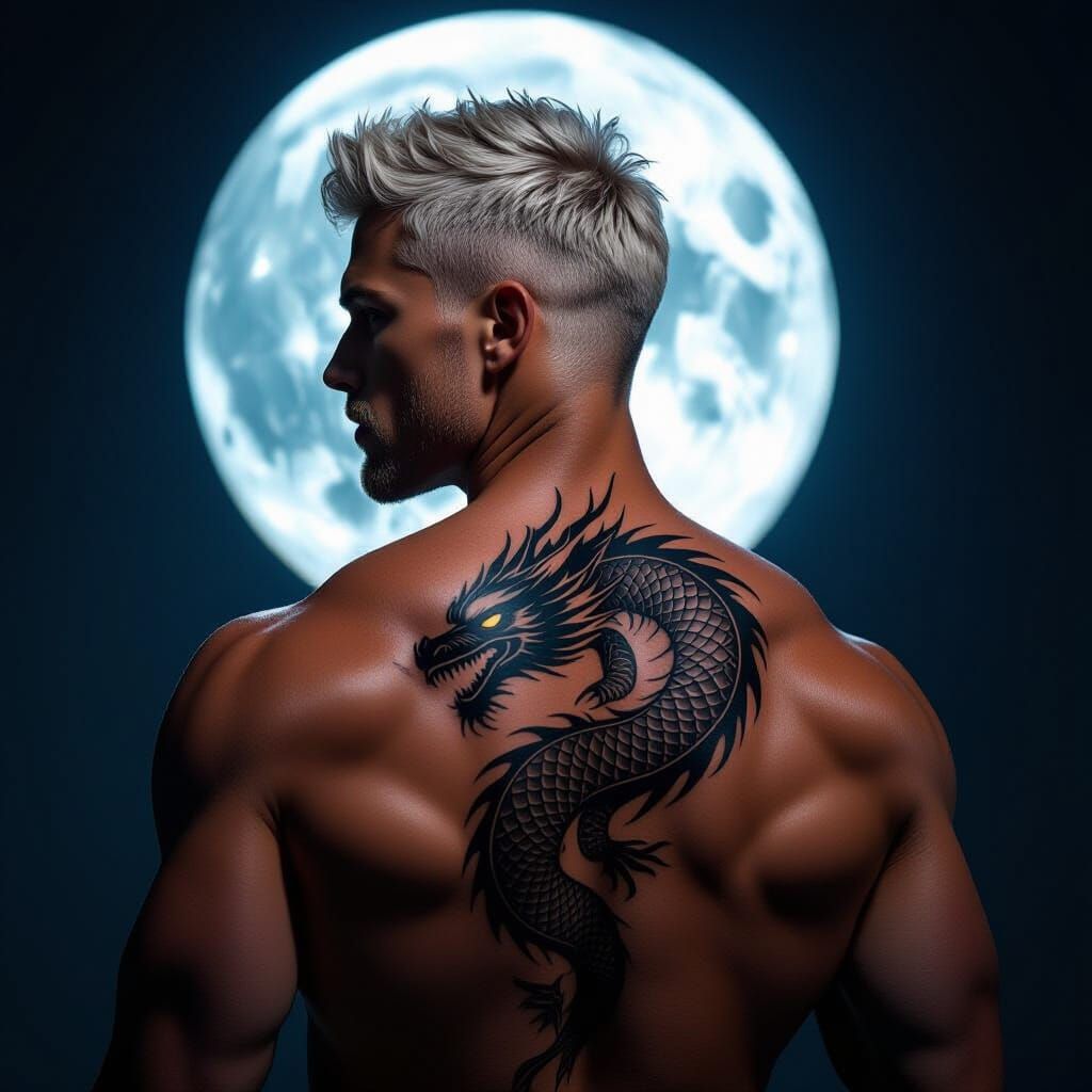 A fit man with white-blonde hair stands in a dark room, with moonlight highlighting a detailed dragon tattoo on his back. Photorealistic style with film grain and cinematic lighting.