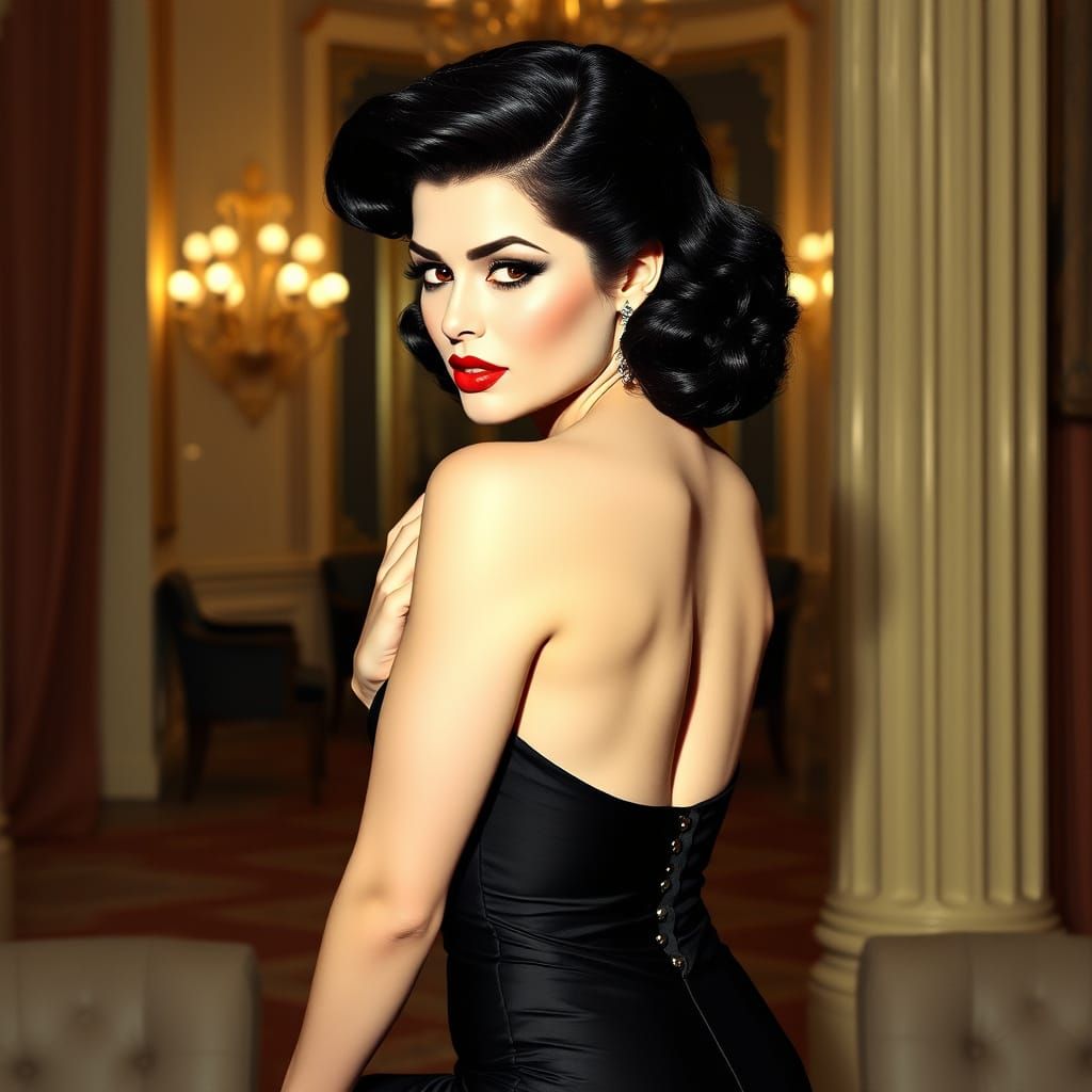 A striking picture of a raven-haired pin-up woman with pale skin, wearing a black gown and high heels. The artwork evokes a classic pin-up aesthetic in a luxurious Old Hollywood setting.