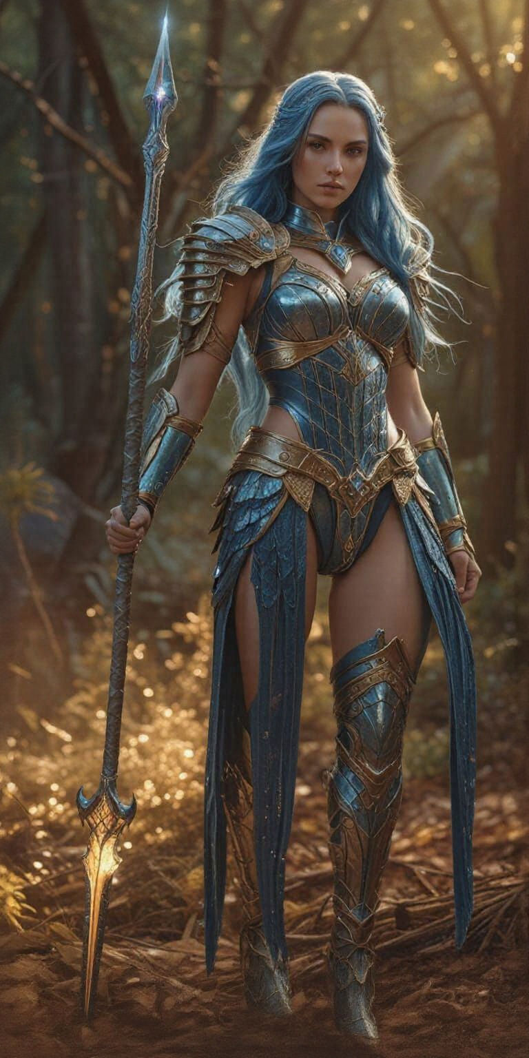 This image shows a female warrior in crystalline armor, holding a glowing spear. She has long, flowing blue hair. The digital art features soft, warm cinematic lighting and complementary colors.