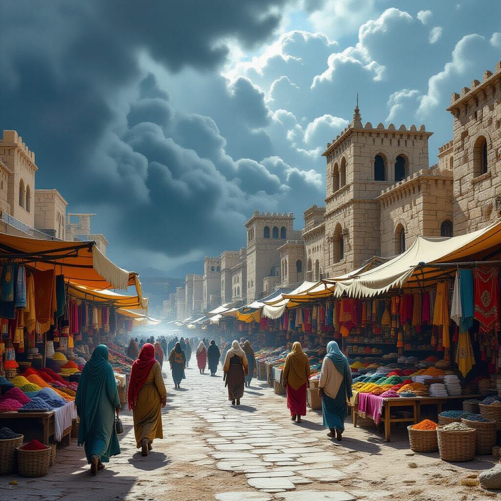 This image shows a medieval desert town preparing for a storm. A circular market bustles with shoppers beneath a heavy, grey sky, depicted with intricate stone architecture and vibrant colors in a matte painting style.