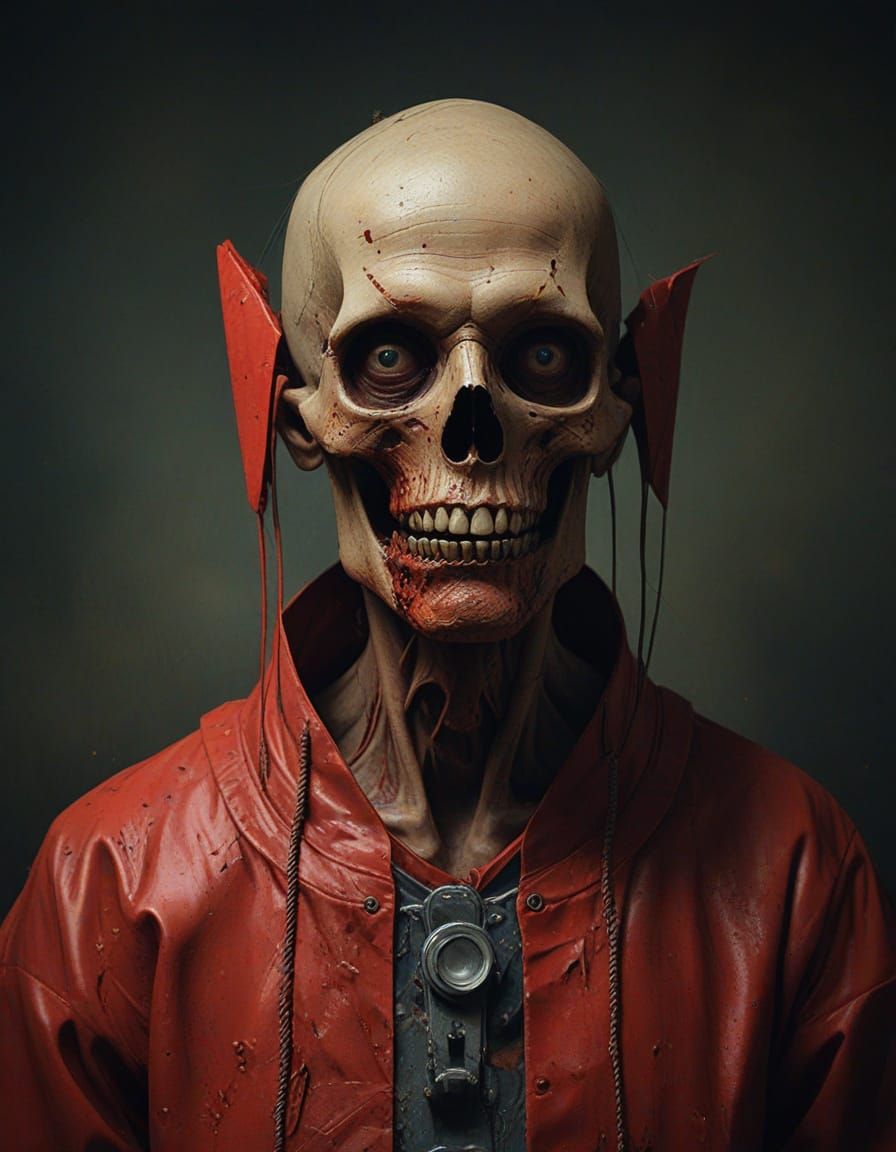This image shows a macabre impasto painting with electric crimson hues. The deep color palette and parallax effects give it a surreal, unsettling quality, reminiscent of historical art styles.