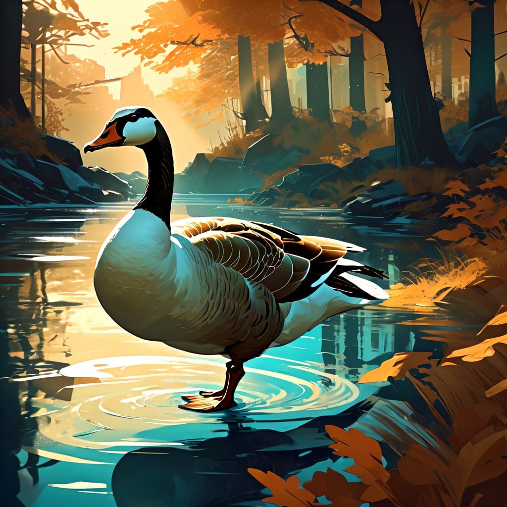 A goose struts confidently in a detailed illustration. Features cinematic lighting, vibrant triadic colors, and a touch of futurism with eldritch background elements. Rendered in 8k resolution.