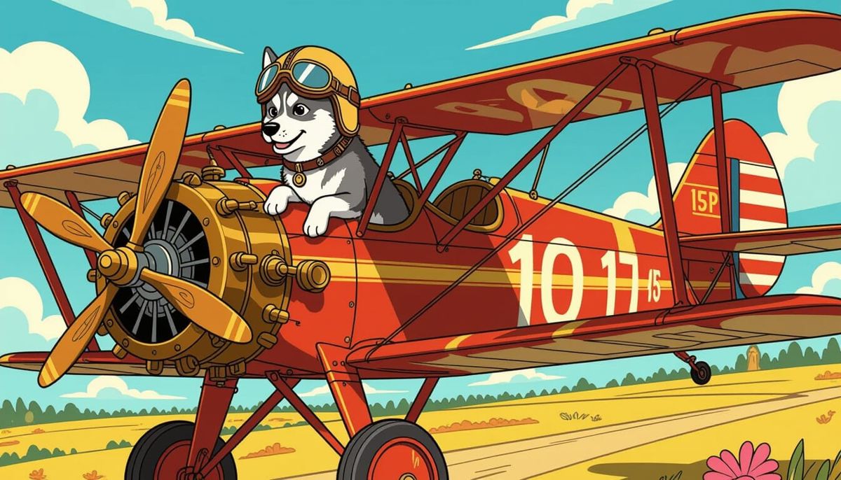 A humorous cartoon of a husky pilot in a steampunk biplane. The image features a whimsical, candy-colored landscape below, rendered with bold outlines and vibrant colors.