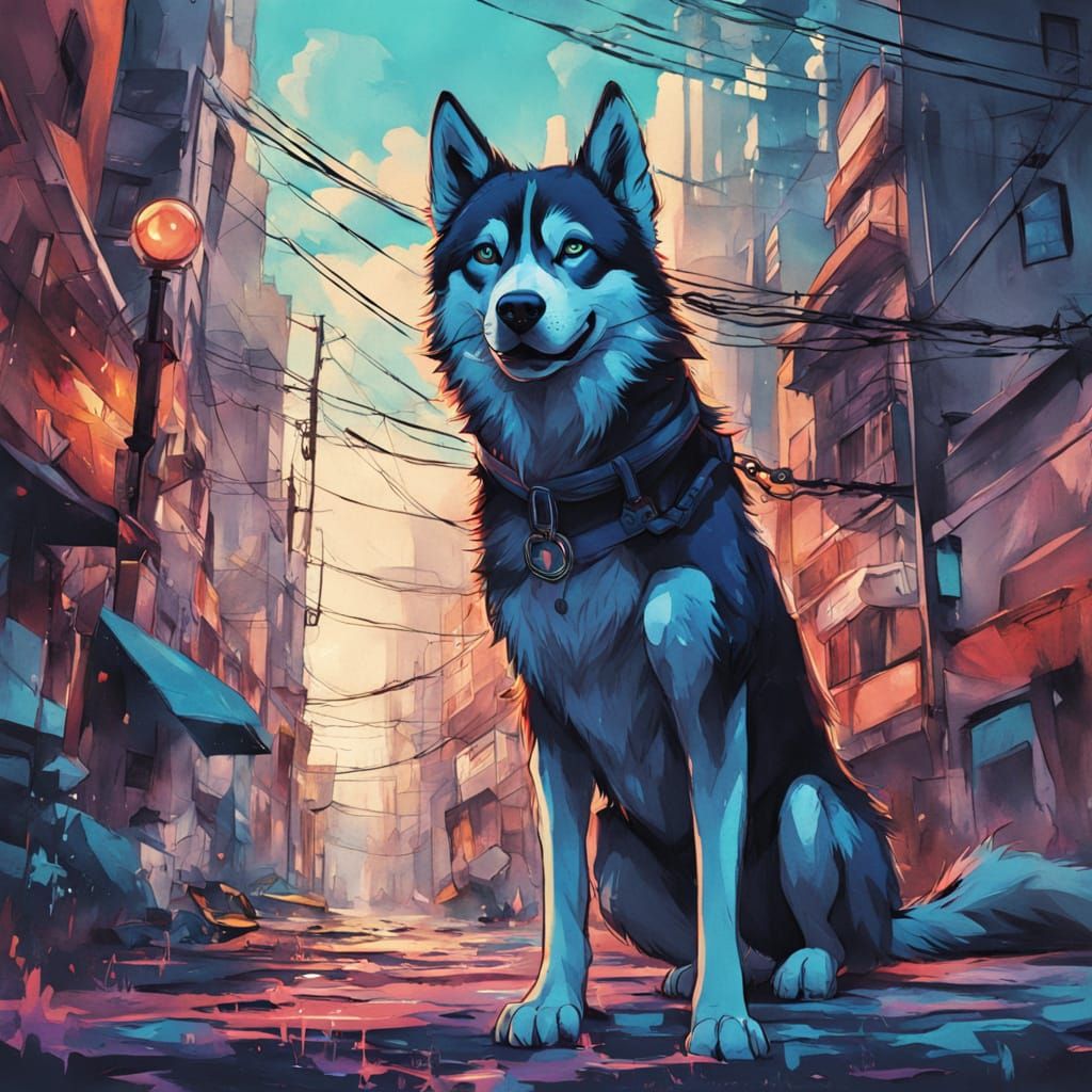 This stunning piece of graffiti art captures a husky in mid-shot, pulling a sled through a vibrant, abstract cityscape. The street art style is characterized by melting oil gouache and acrylic textures, with thick brush strokes and impasto gouache. The background is a colorful polychromatic masterpiece w...