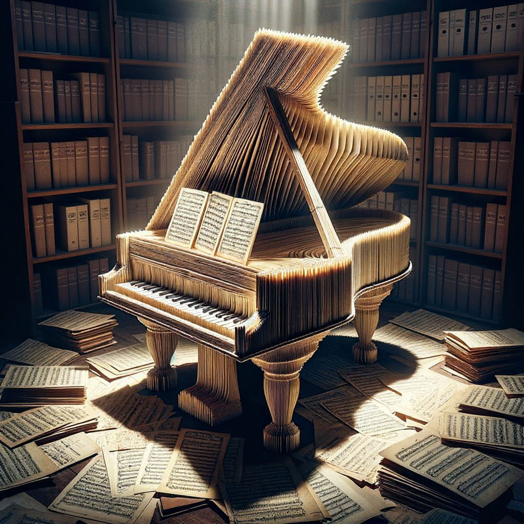 This image shows a harpsichord meticulously crafted from sheet music and parchment. Origami-inspired folds create light and shadow. The open lid reveals an interior of curled, overlapping pages, enhancing the tactile, reverent ambiance.
