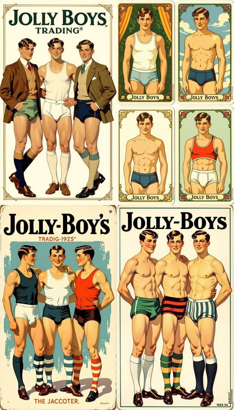 This image shows vintage trading cards from 1925 featuring handsome young men modeling period-appropriate underwear. The cards showcase various styles, including long johns and boxer shorts, with the "JollyBoys Trading™" logo.