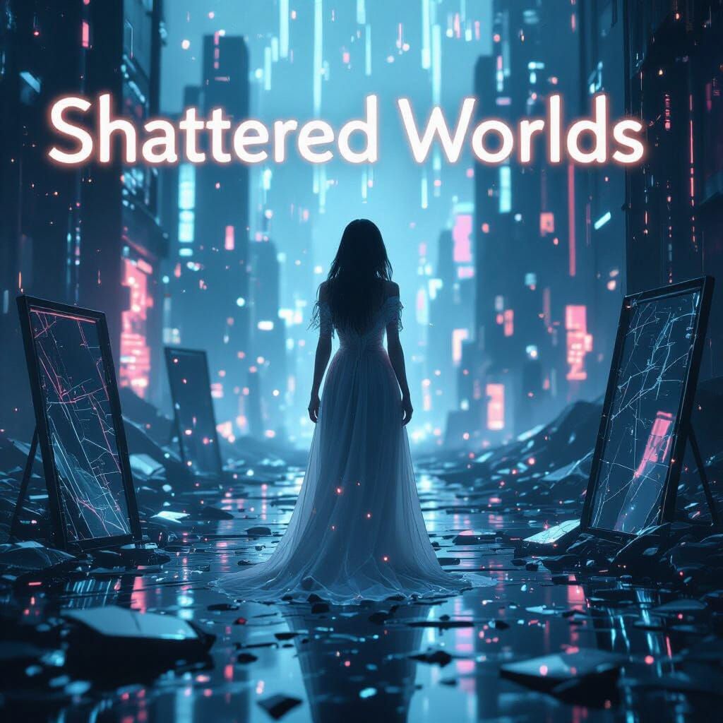 A melancholic sci-fi scene depicting a woman formed from code in a fragile glass city. Features cold neon, pastel glows, and a dreamlike atmosphere with cosmic elements.