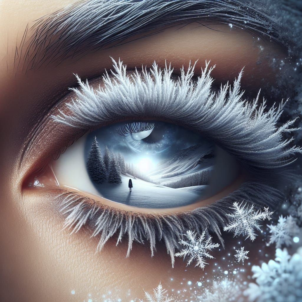 A striking picture of a South Asian woman's eyes reflecting a snowy landscape. The image is hyperrealistic and detailed, with snowflakes and frost creating a serene winter aesthetic.