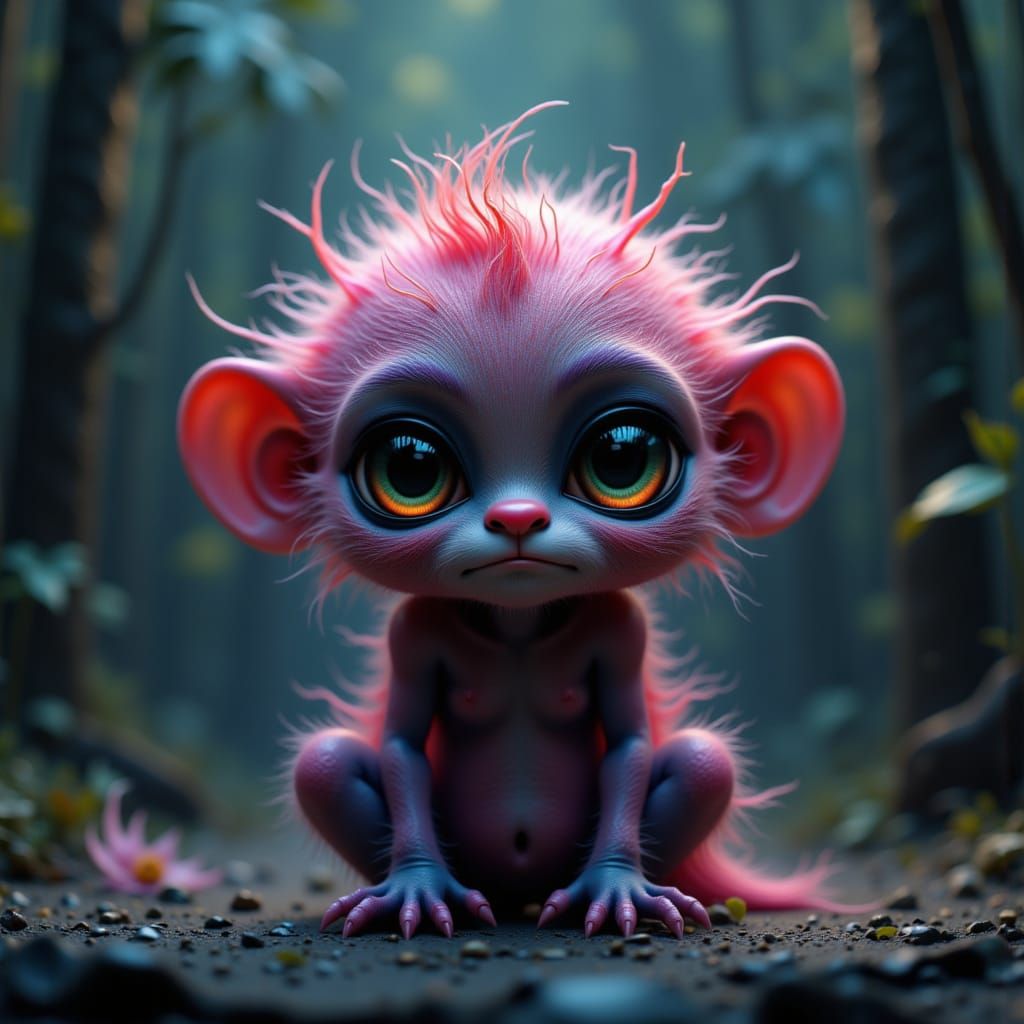 This image shows a sulky, hairy baby monster in a corner, rendered in detailed CGI cartoon style. The artwork features deep colors and intricate details, reminiscent of fantasy concept art.