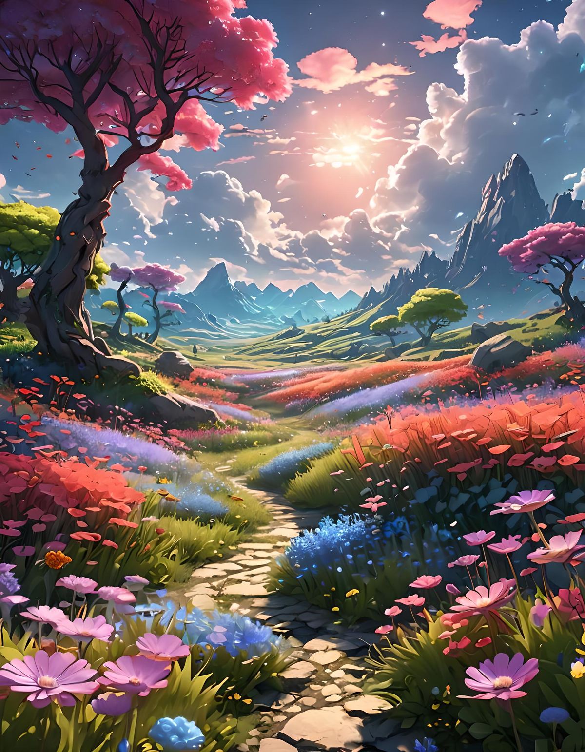This image shows a fantastical landscape with neon flora and fauna illuminating a wildflower field under puffy clouds. The vivid scene has a detailed aesthetic, rendered as 3D anime art.