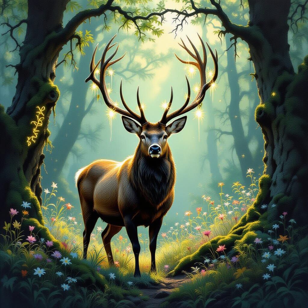 A shimmering stag with moss and wildflowers on its antlers in a mystical forest. Rendered in a textured impasto style with luminous lighting and breathtaking detail.