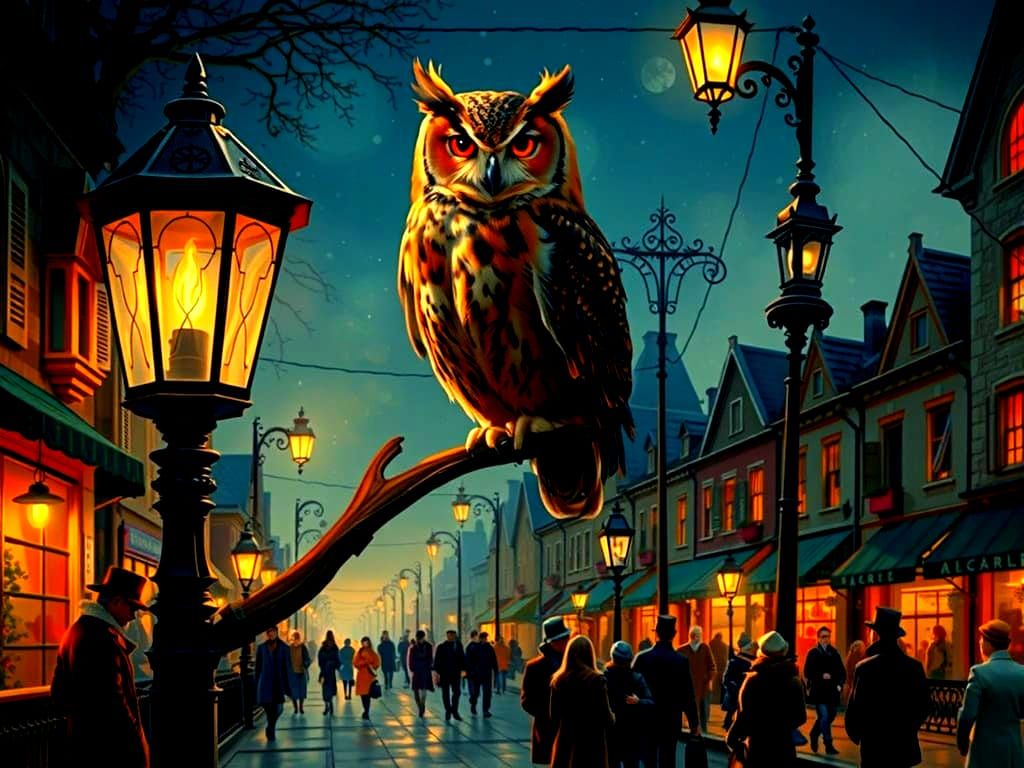 A captivating image of an owl perched and observing people walking beneath a vintage gas lamp. The soft glow creates a warm, inviting atmosphere in this nighttime scene.