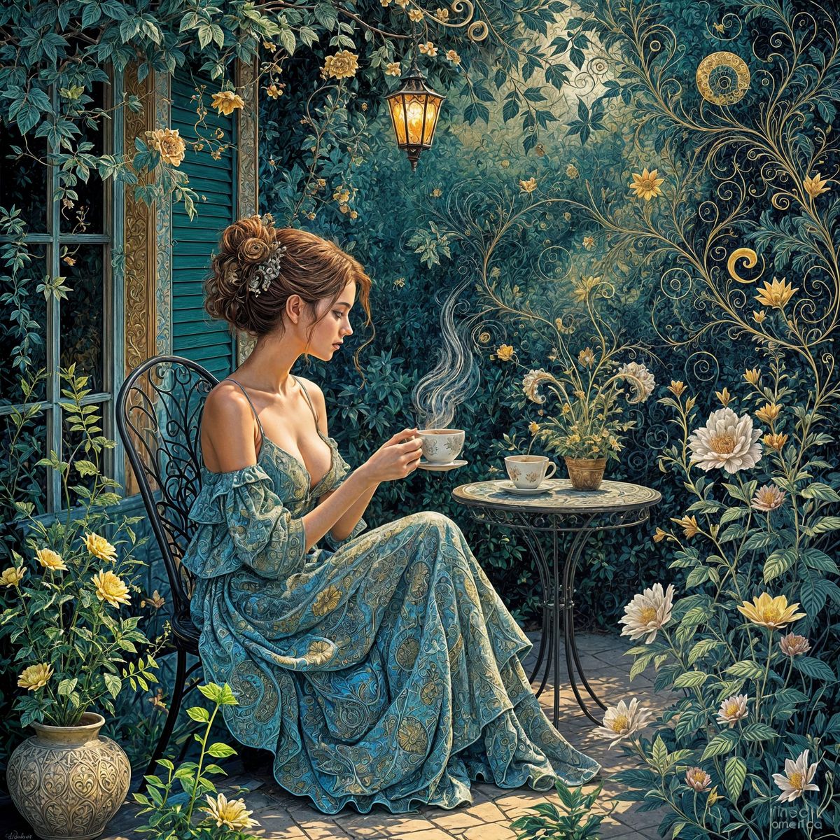 This image shows a steaming cup of coffee on a patio, surrounded by intricate patterns and hyper-detailed geometric shapes in a unique blend of abstract art styles.