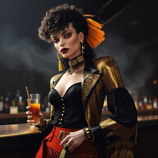 This image shows a stylish non-conforming person and a friend in a smoky bar scene. The image is in an expressionist style, with bold colors and intricate details, reminiscent of the 1980s.