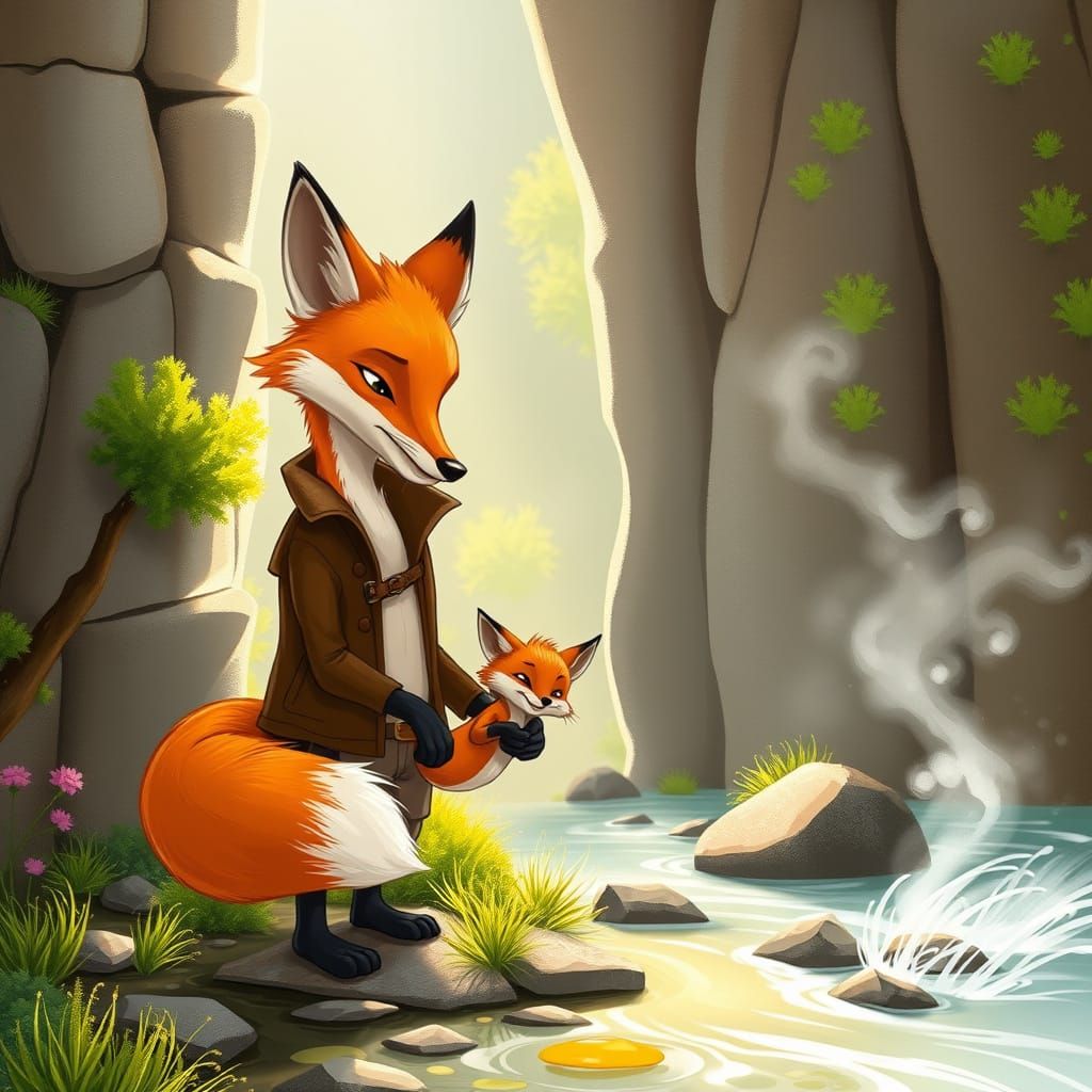 This image features a heartwarming scene of a fox father and child amidst a lush, springtime landscape, set against a warm, gray rocky cliff backdrop with vibrant foliage and a rushing stream.