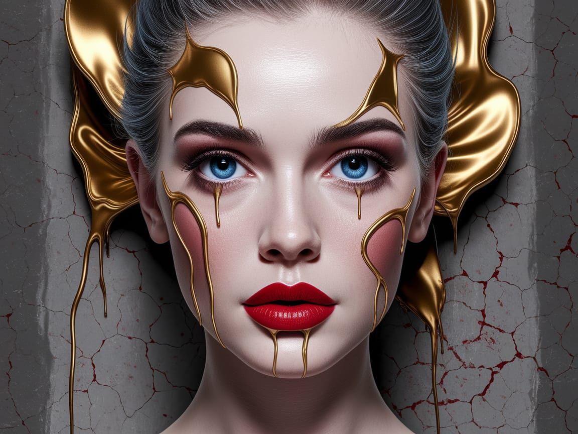 A hyper-detailed, minimalist portrait of a woman's face crafted from liquid gold. Features blue eyes, red lips, and drifting gold on a cracked, textured plaster background in pastel colors.