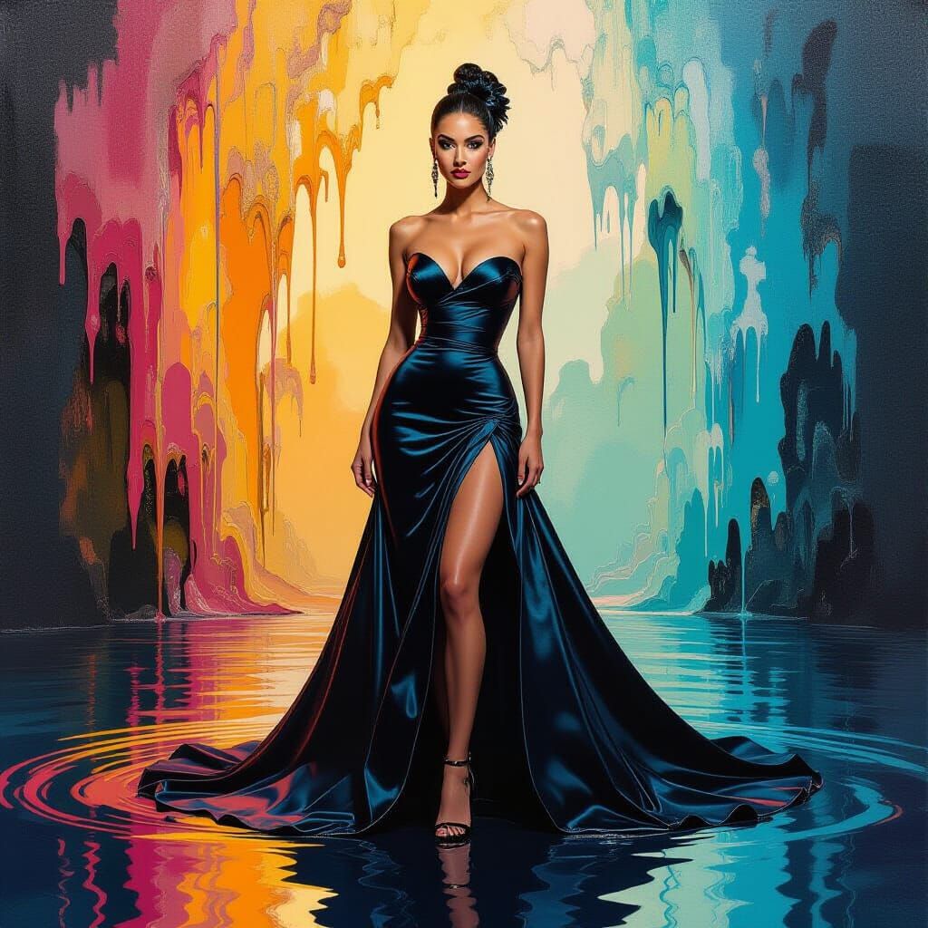A striking picture of an elegant woman in a surreal, melting dreamscape. The scene blends deep colors and intricate details in a fantastical, surrealist aesthetic as 8k resolution concept art.
