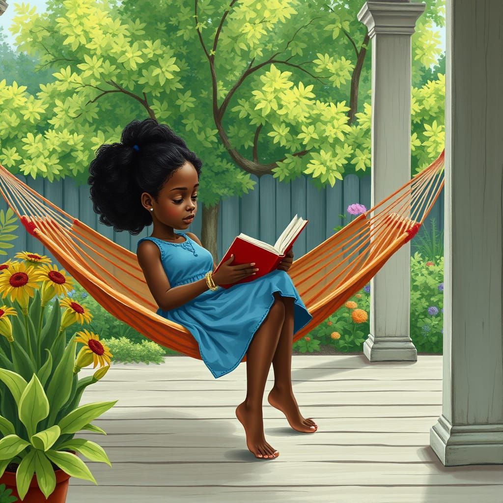 A serene image of a Black girl in a blue dress reading on a hammock. The scene features a welcoming porch and a lush garden backdrop, creating a peaceful atmosphere.