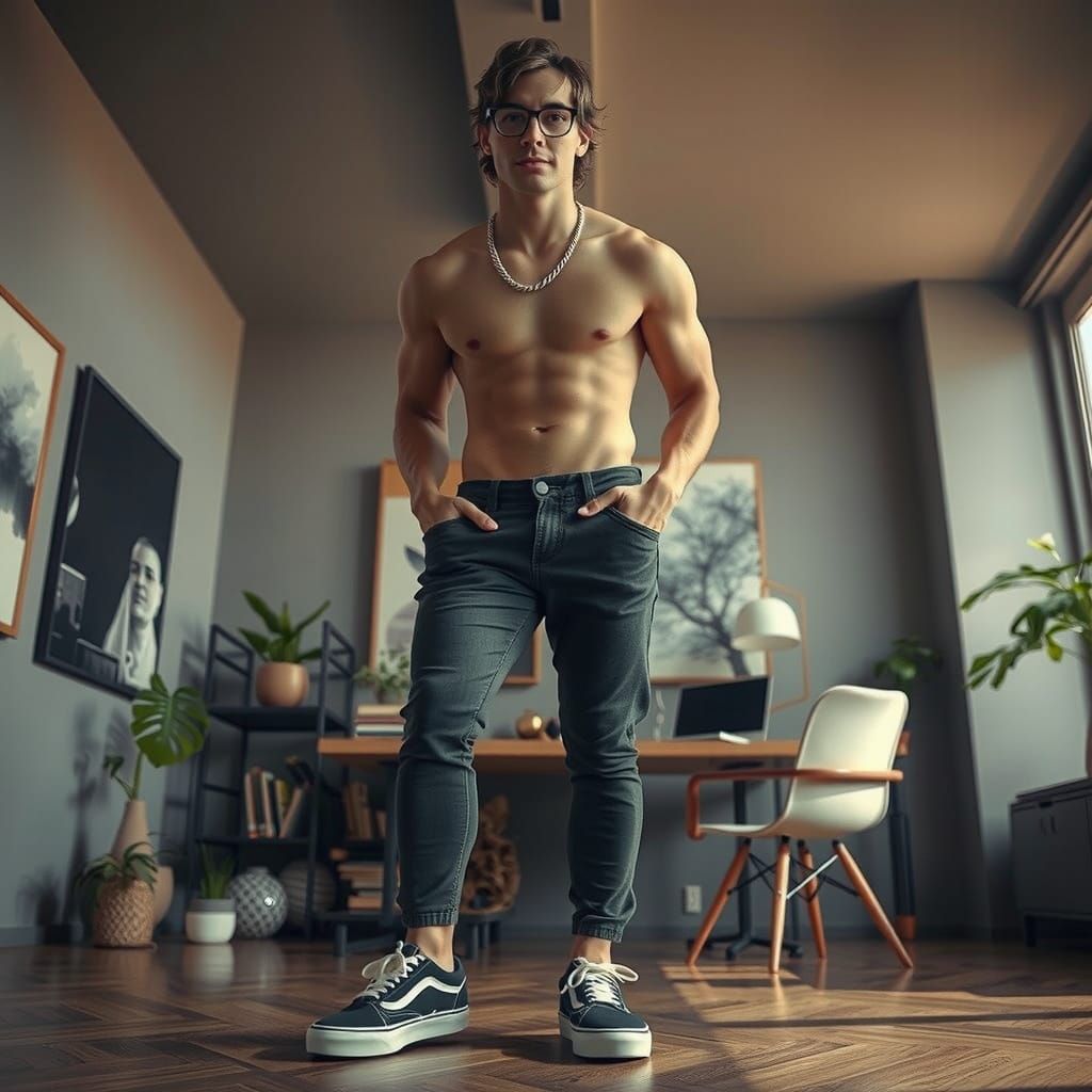 This image shows a handsome athletic man in a modern apartment. The low-angle, full-body shot emphasizes his physique, enhanced by warm lighting and minimalist decor in a photorealistic style.