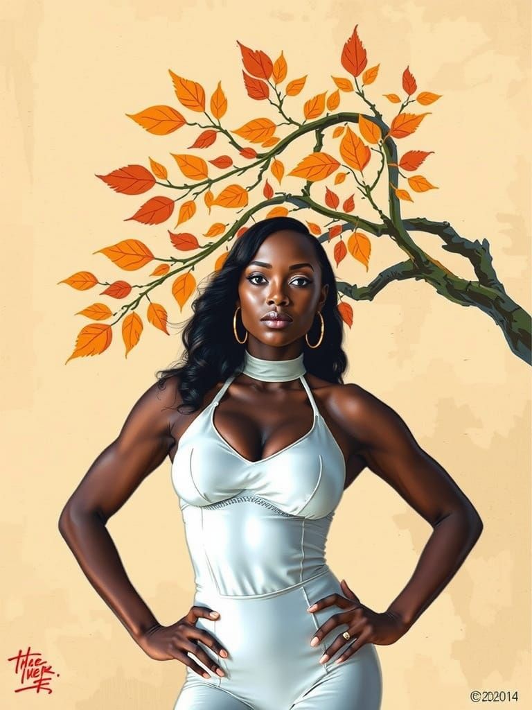 This image features a strong Black woman with wavy hair and gold jewelry, wearing a white halter top. Autumn leaves frame her against a soft background, creating an artistic, poster-like effect.
