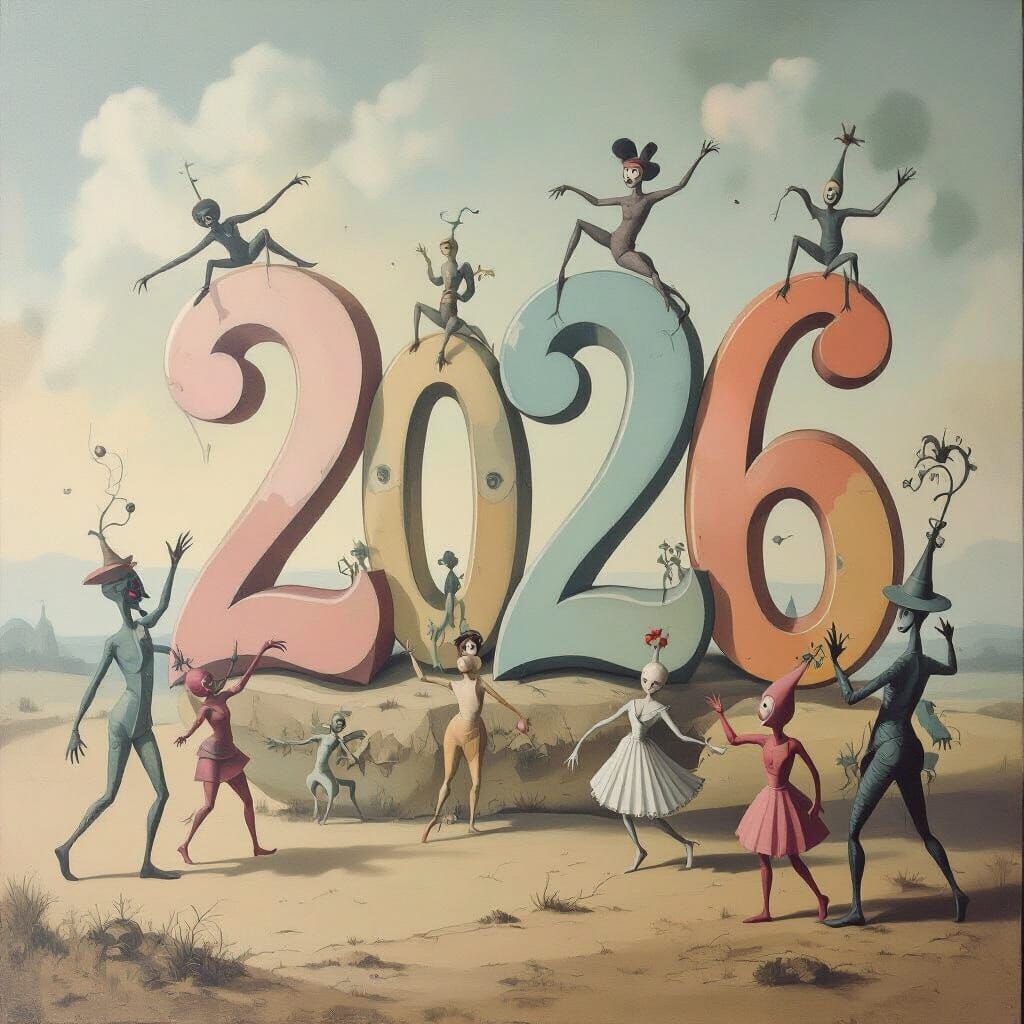 This image depicts the year '2026' in a surreal, whimsical style with elongated forms and strange creatures. It features soft textures and a dreamlike atmosphere with painterly brushstrokes.