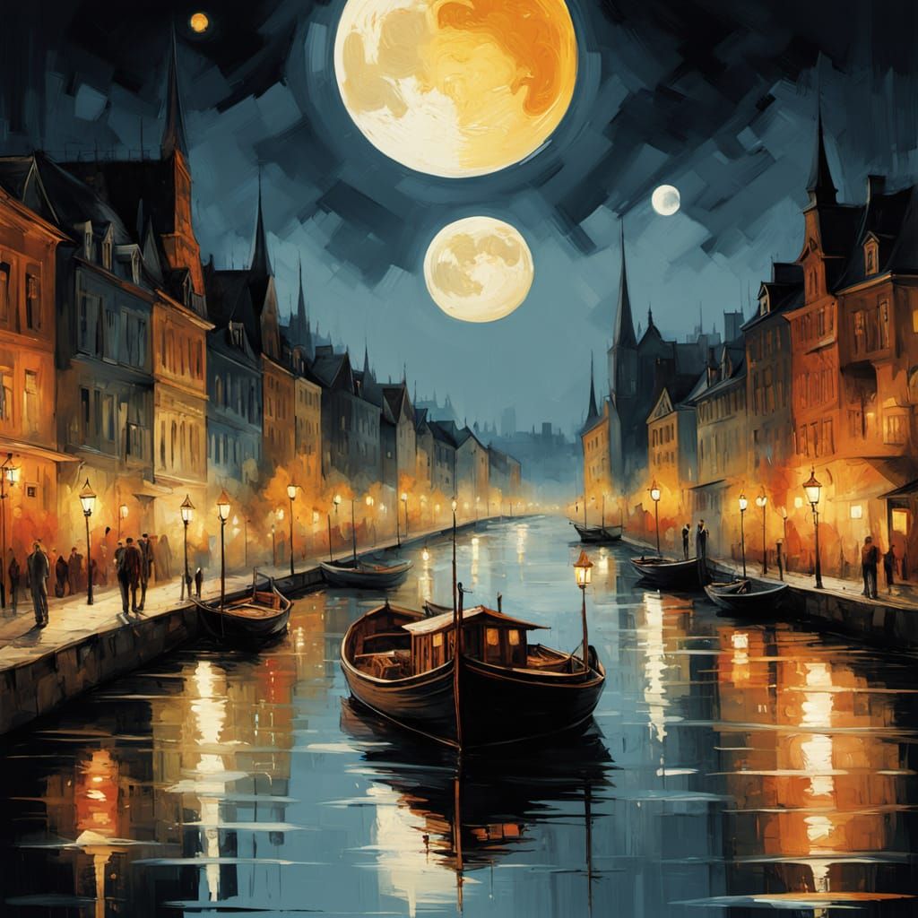 A nighttime European city reflected in a wide river, illuminated by warm light and floating lanterns. This magical scene features vibrant colors, gold accents and intricate textures.