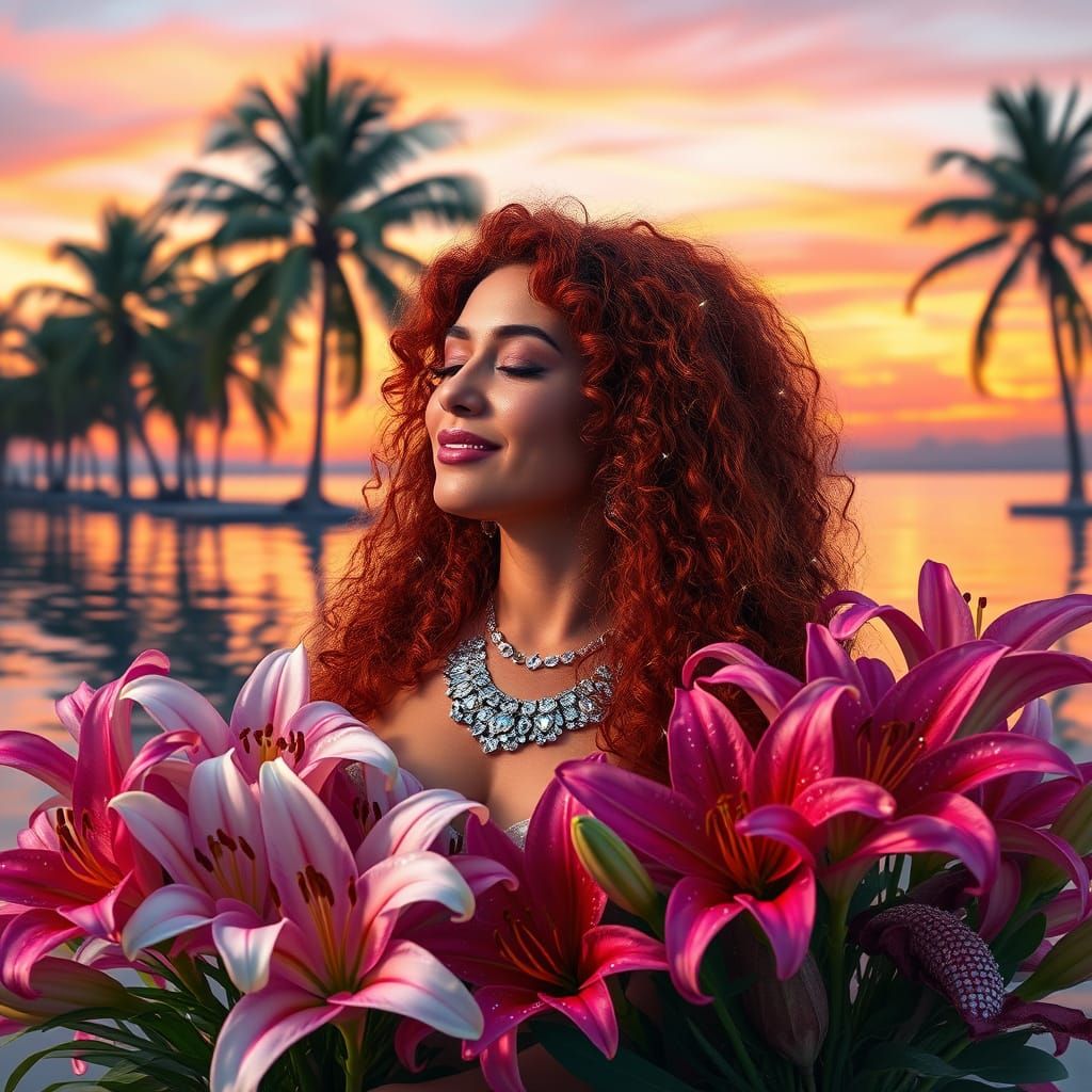 A portrait of a woman with long, curly reddish-brown hair and a gentle smile. She is adorned with sparkling lights and jewelry, surrounded by lilies against a sunset, in an Art Nouveau style.