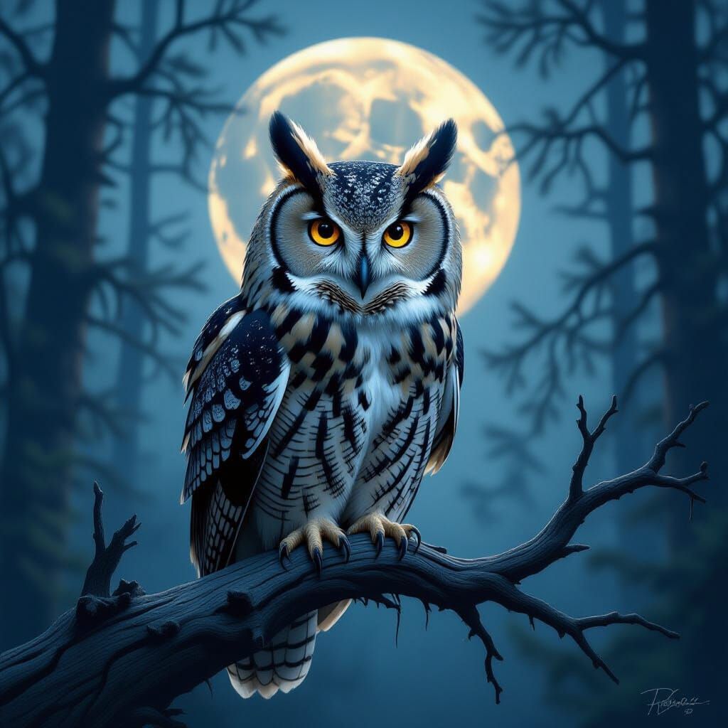This image shows a wise old owl with detailed feathers, sitting on a branch in a misty forest. The owl's eyes gleam, and the artwork features realism with chiaroscuro and earthy tones.