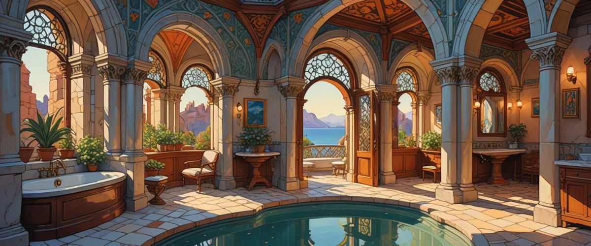 A vibrant comic book style image of an outdoor bathroom with fantasy architecture. The scene is bathed in warm afternoon sunlight, with intricate details and cheerful colors, reminiscent of Ghibli-esque scenery.