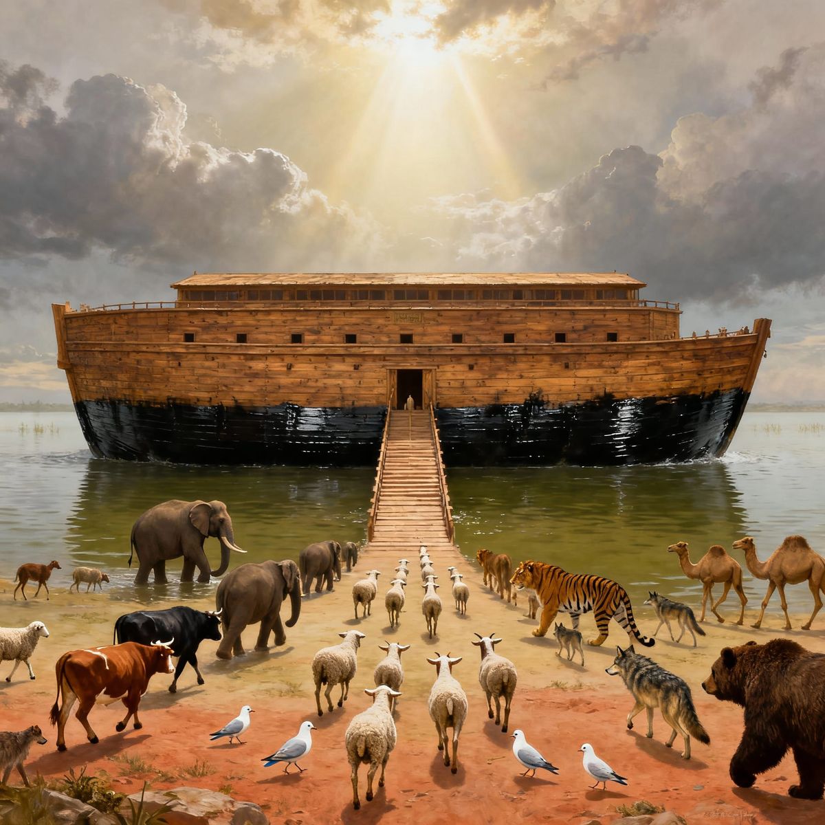 This image depicts Noah's Ark, a massive wooden vessel, floating on peaceful floodwaters under a cloudy sky. Pairs of animals approach the ramp, showcasing divine preparation and preservation in a realistic, biblical illustration style.