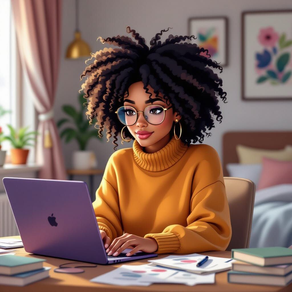 This image shows a Black woman with an afro, wearing glasses and a sweater, working on a purple laptop. The scene is rendered in a vibrant animated style inspired by Studio Ghibli.